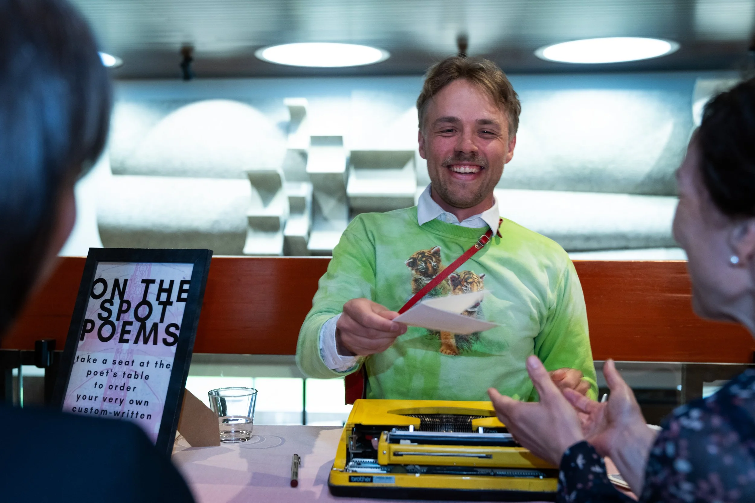 I take my citric-yellow typewriter to events, rooftops, and markets and transform my encounters with people into improvised poetry.